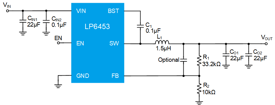 The LP6453X is a high efficiency synchronous buck converter supporting up to 3A output current and low heat. The LP6453X employs an adaptive constant-on-time (COT) control scheme to achieve fast load transient response and without external compensation. The external components are minimized, requiring only one inductor, two resistors, and two capacitors.The LP6453X supports both aluminum polymer capacitors and ceramic capacitors without extra compensation components.The LP6453/LP6453T/LP6453A integrates PFM (Pulse Frequency Modulation) operation, which helps maintain the system efficiency at light load. The LP6453AF integrates FPWM (Forced PWM) operation, which helps achieve very small output ripple over all load range. The LP6453X also integrates multiple protection functions, i.e., over-current protection (OCP), over temperature protection (OTP), under-voltage lockout (UVLO), and short circuit protection (SCP).The LP6453X is available in a small 6-pin 1.6mmΧ2.9mm SOT23-6 package or 1.6mmΧ1.6mm SOT563 package.