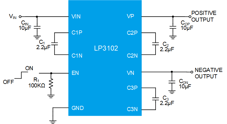 The LP3102 DC/DC converter integrates two low noise, high efficiency charge pumps for dual outputs, which consist of one inverting output and a step-up output. The device operates from 2.5V to 4.8V input, and provides a step-up output voltage (VP) of 2x the input voltage. The negative inverting output (VN) is -1x inverted from the positive output VP. The LP3102 is available in a small DFN-10 pin package that features a bottom side exposed thermal pad to provide optimal heat dissipation. The small package size and low external parts count make the device ideally suitable for TFT LCD applications of mobile products. The device is rated to operate from -40℃ to +85℃ ambient temperature range.