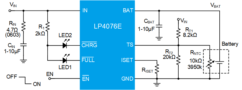 The LP4076/LP4076E is a highly advanced linear charger for single-cell Li-Ion and Li-Polymer batteries.The device is ideally suited for portable applications due to low number of external components required.The device employs a full charge algorithm with trickle current, constant current (CC), constant voltage (CV) modes, charge termination and automatic recharge. The device supports charge current up to 1A, programmed by an external resistor. The device can withstand an input voltage up to 36V, which can protect the charger from any accidental insertion of a high-voltage supply or a hot insertion. The device can withstand a BAT voltage up to 14V, which is suited for power battery applications.Without an input supply, the battery leakage current is only 30nA typical. The device provides various safety features for battery charging, including input under voltage lockout (UVLO), input over-voltage protection (OVP), battery reverse connection protection, cold/hot battery temperature protection, and thermal regulation protection that is implemented by reducing the charge current when the junction temperature reaches 140°C.The LP4076/LP4076E is available in an ESOP-8 package.
