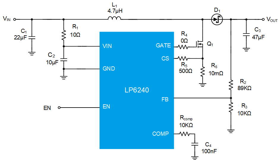 The LP6240 is a high performance non-synchronous boost converter controller that drives all N-channel power MOSFETs. Synchronous rectification increases efficiency, reduces power losses and eases thermal requirements, allowing the LP6240 to be used in high power boost applications. A 4.5V to 24V input supply range encompasses a wide range of system architectures. The LP6240 features operating fixed-frequency at 600kHz and a 1.215V reference voltage. The CS pin can adjustable the current limited and slope compensation by permutations the external resistor .Other features include over current protection (OCP), output over voltage protection (OVP), andunder-voltage lockout (UVLO). The LP6240 is available in a space saving SOP-8 (0.5mm pitch) package.