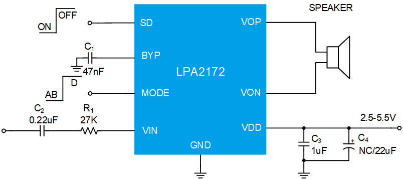 The LPA2172 is a 5.2W, class-F mono audio amplifier integrated Class AB/D optional mode. It is capable of delivering 5.2watts of continuous average power to a 2Ω BTL load with less than 10% distortion (THD) from a 5VDC power supply. It offers low THD+N, allowing it to achieve high-quality Power Supply sound reproduction. The new filterless architecture allows the device to drive the speaker directly requiring no low-pass output filters, thus to save the system cost and PCB area. The LPA2172 is available in ESOP-8.
